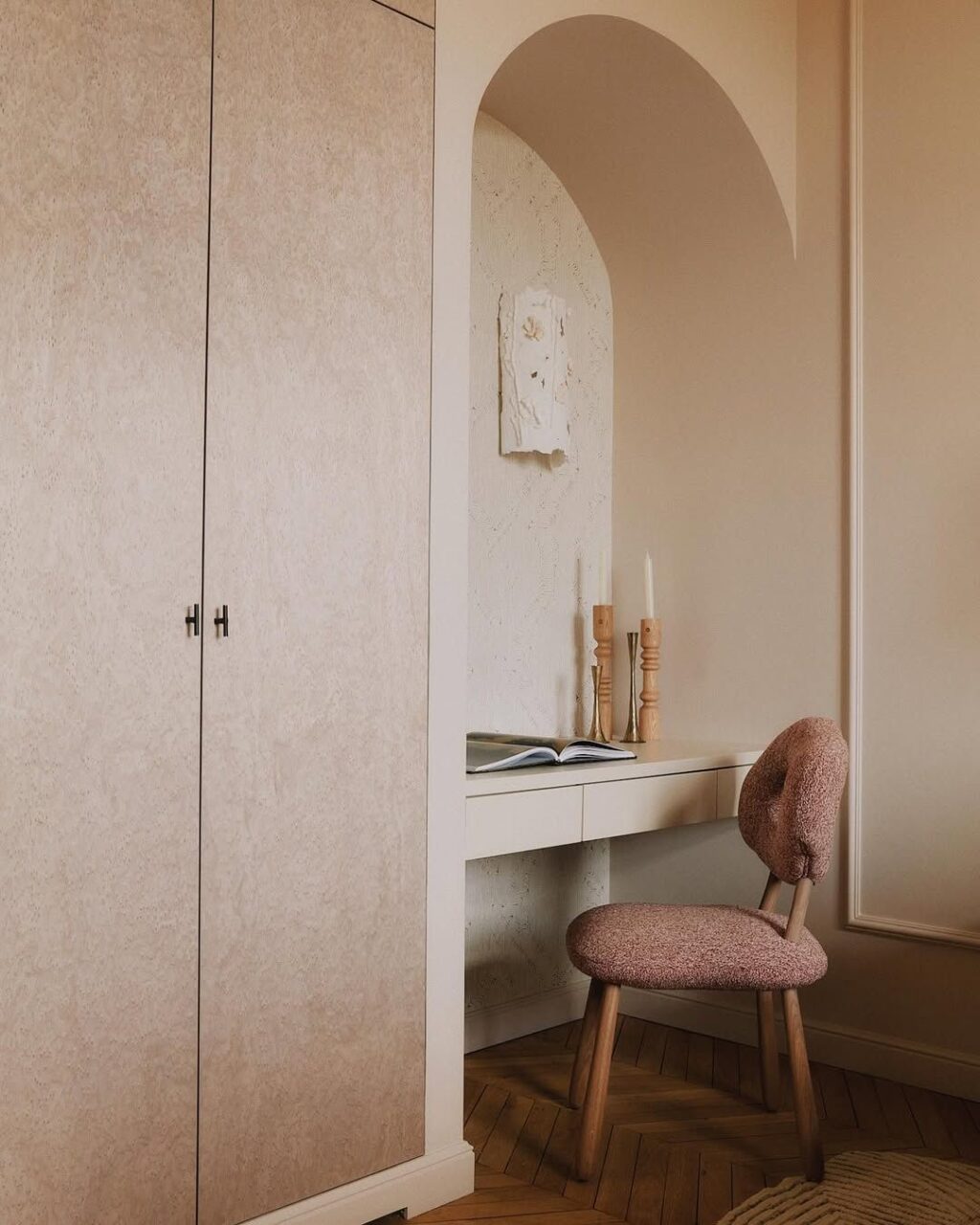 Nella stanza padronale progettata da Caroline Andreoni i toni del rosa sfumano nel beige regalando un’atmosfera ovattata anche all’ufficio mignon. Ton sur ton, la sedia imbottita si accosta alla scrivania sospesa, seminascosta sotto un arco illuminato da un’applique in carta lavorata. Foto di Clement Gerard.