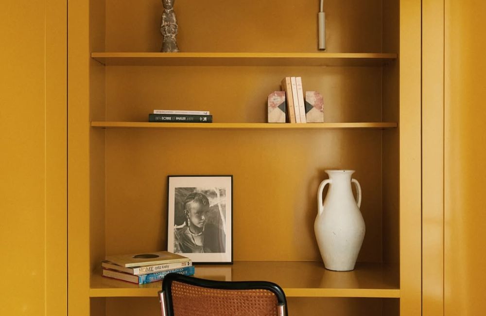 Diventano più allegre anche le incombenze quotidiane se sbrigate seduti a questo angolo di sole. Giallo ocra quanto l’armadiatura che lo ospita, il mini studio ha piano di lavoro e mensole nello stesso colore, perfetto sfondo per oggetti, libri e complementi d’arredo iconici. Progetto di Andrea de Busni, foto di Clement Gerard.