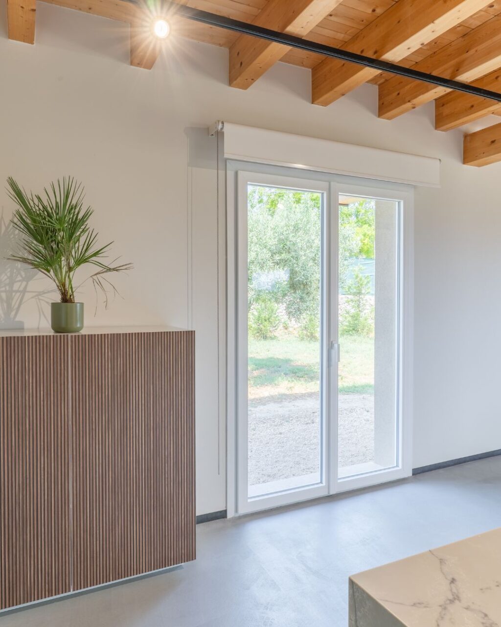 Cambia la collezione ma non il brand quando si passa agli scorrevoli. Dall’apertura facile e leggera, le porte e finestre in Pvc Slide Plus di WnD sono state scelte per allargare lo spazio e lo sguardo nella grande sala che si affaccia su cortile e giardino. Pratiche, versatili e salvaspazio, sono funzionali e scenografiche allo stesso tempo, trasformando ogni apertura in un gesto naturale che collega l’interno con l’esterno. Tra le caratteristiche di questi scorrevoli troviamo la loro capacità di raggiungere grandi dimensioni, fino a una superficie massima di 6,2 mq, pur mantenendo ottimi parametri di isolamento termo-acustico, con un Uw fino a 1,5 W/m2K.