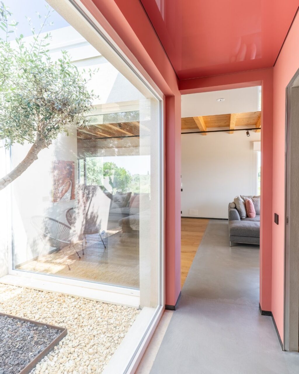 Ogni dettaglio interno della casa parla dello stesso desiderio di essenzialità e cura, dai controsoffitti in telo termoteso Vecta Design al microcemento utilizzato a pavimento nel creare un tappeto uniforme e tattile che accompagna gli ambienti. Le finiture aggiungono calore e raffinatezza, in equilibrio con una palette dominata da toni neutri e naturali, arricchita però da accenti di carattere. Così, se la zona di passaggio tra il giorno e la notte è caratterizzata da pareti rosa salmone, il bagno punta sull’alternanza tra il bianco e intense sfumature blu.