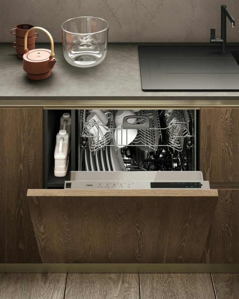 Dal design funzionale e sofisticato, dove ogni dettaglio è curato con attenzione per creare un ambiente accogliente e di forte impatto estetico, questa soluzione spicca per la sua essenzialità. Sviluppata a L, la cucina presenta colonne imponenti e un modulo a giorno per l’esposizione ordinata e accessibile degli oggetti. Da questo nucleo si estende sulla sinistra il piano di lavoro, che poggia su basi che comprendono un modulo con una larghezza di 75 cm studiato per integrare una lavastoviglie a incasso.