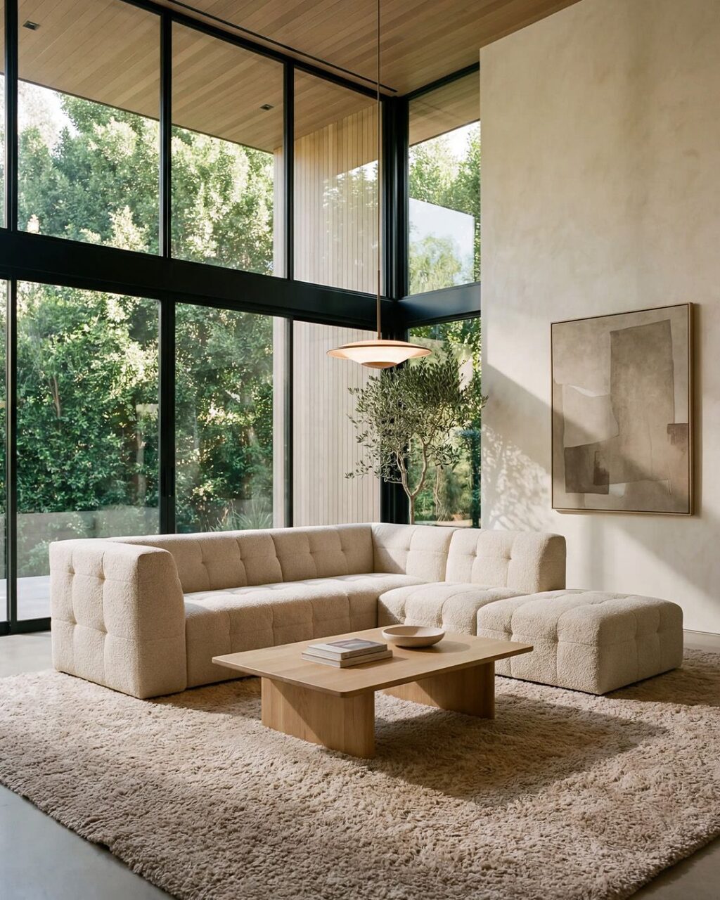 La possibilità di comporlo su misura con diversi moduli, poltrona e pouf lo rende particolarmente adatto ad arredare spazi contemporanei e ambienti contract, mentre il rivestimento in tessuto bouclé impermeabile e smacchiabile aggiunge praticità all’effetto materico.