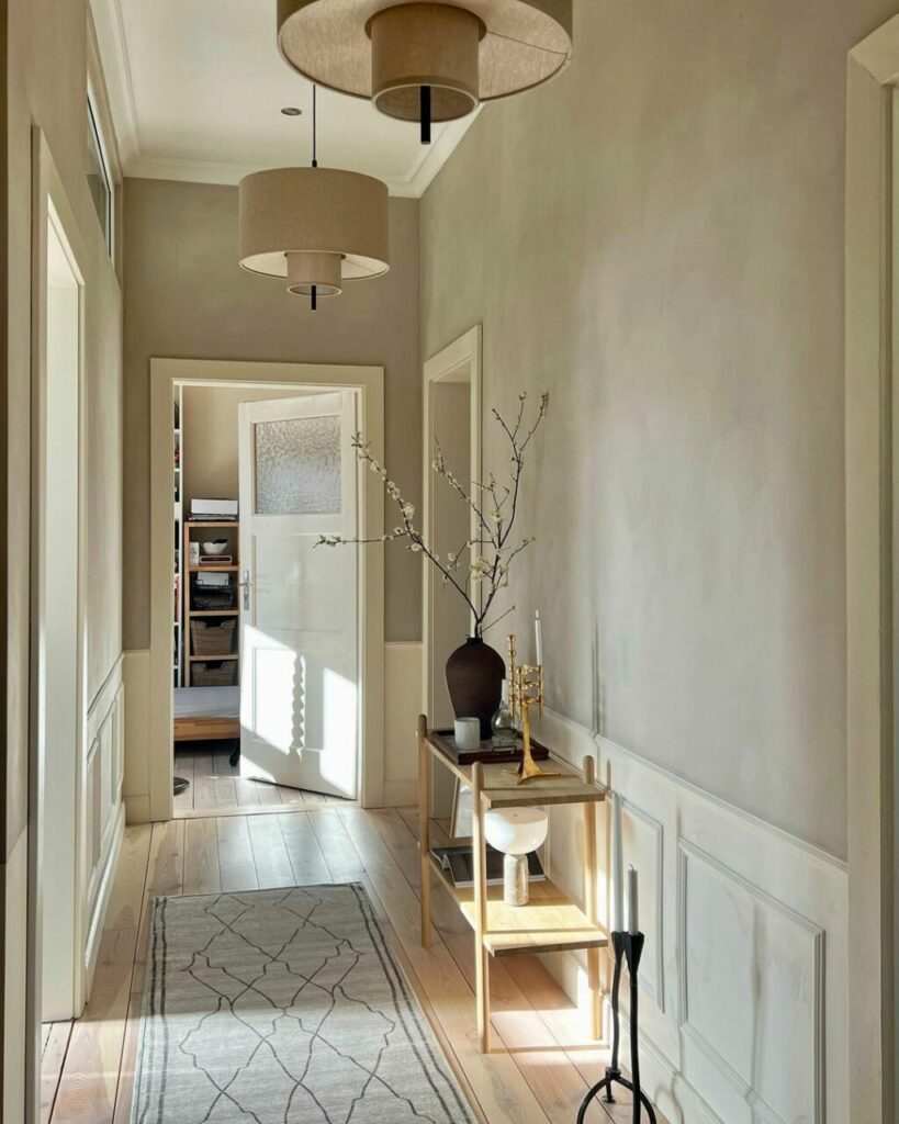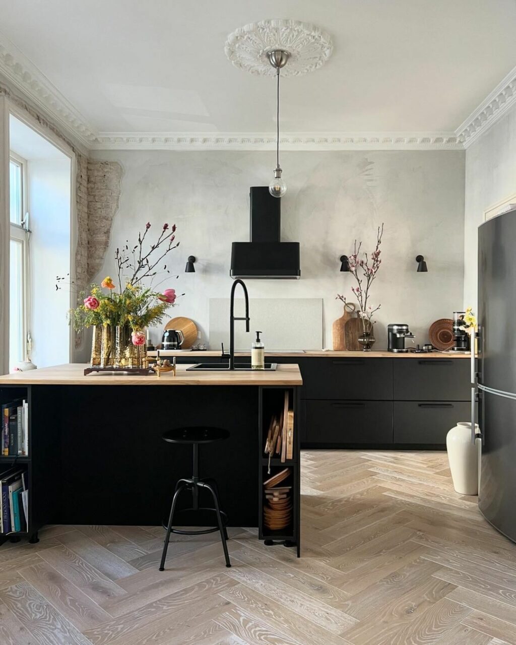 La cucina affaccia sulla zona pranzo e punta su linee pulite e colori scuri, alleggeriti dal top in legno e dagli immancabili mazzi di fiori. Passando alla zona notte, qui l’anima antica della casa incontra la modernità dello stile japandi, con l’iniezione di funzionalità del guardaroba: un sogno di ordine divenuto realtà nonostante gli abiti a vista appesi alle grucce.