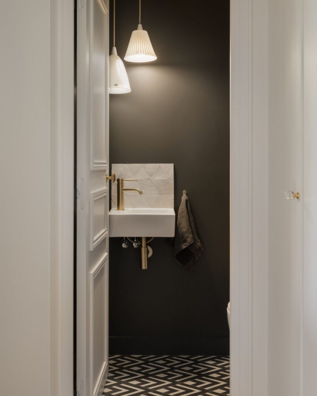 Quando il WC occupa un locale a sé come in questo appartamento parigino, l’installazione di un mini lavandino è la scelta più comune. Comune ma non scontata, come dimostrano i dettagli scelti da Atelier CVD, dalla doppia lampada sospesa all’eleganza del black and white. Foto di François Guillemin. ⠀