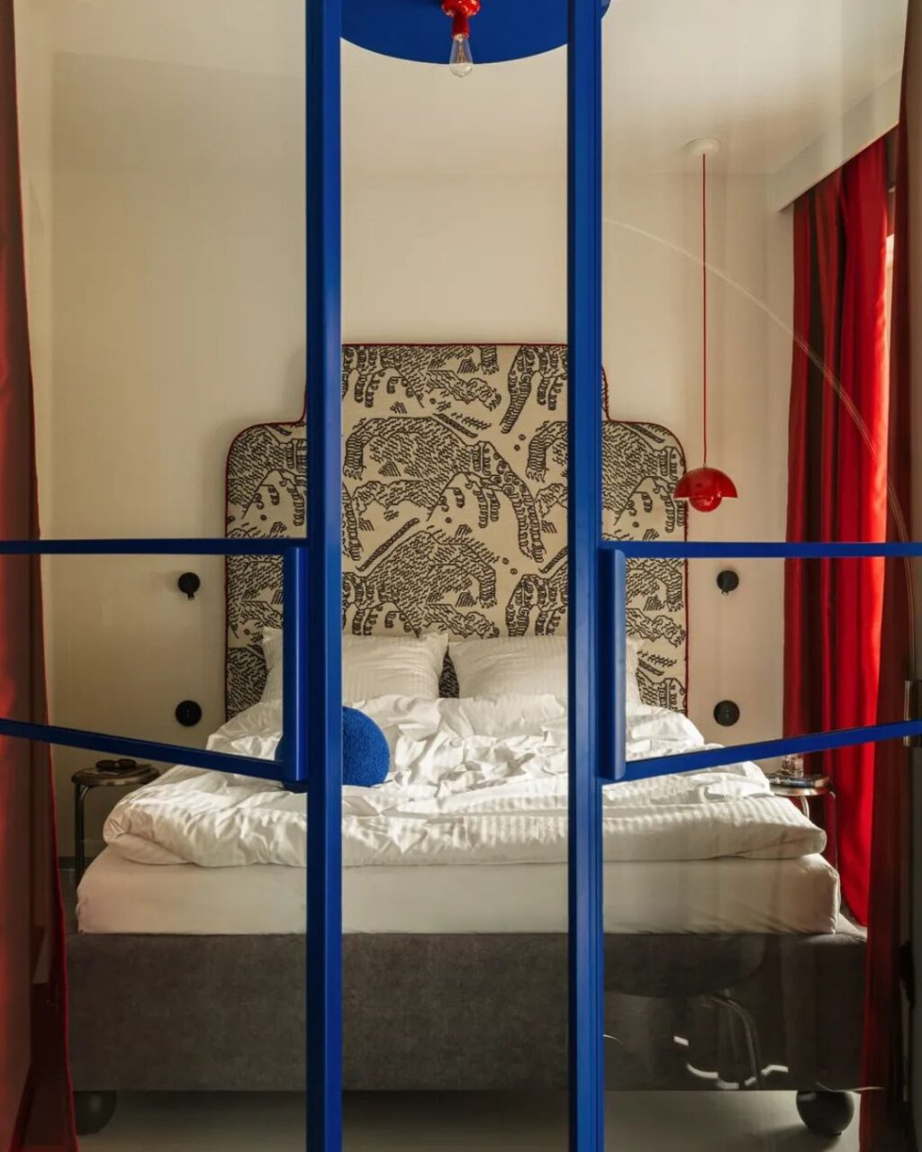 Le case vacanza possono permettersi soluzioni coraggiose. Come quella di fare della stanza da letto l’assoluta protagonista, a vista sulla zona giorno. A sottolinearne la bellezza, la grande vetrata bordata cobalto a contrasto con i dettagli rossi della camera. Progetto di Wojtyczka Pracownia Projektowa, foto di Mood Authors.