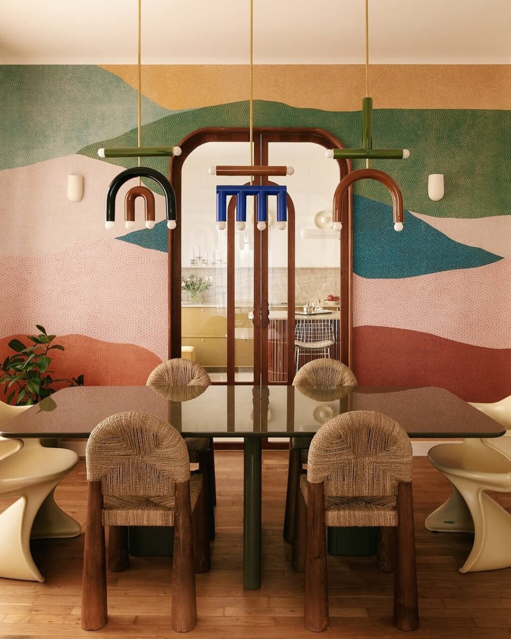 La coloratissima sala da pranzo di questo appartamento parigino guarda alla cucina attraverso una porta a vetri realizzata su misura. Dal profilo stondato che richiama la forma delle lampade e un generale senso di morbidezza che caratterizza l’intero ambiente. Progetto di Andrea de Busni, foto di Clément Gérard.