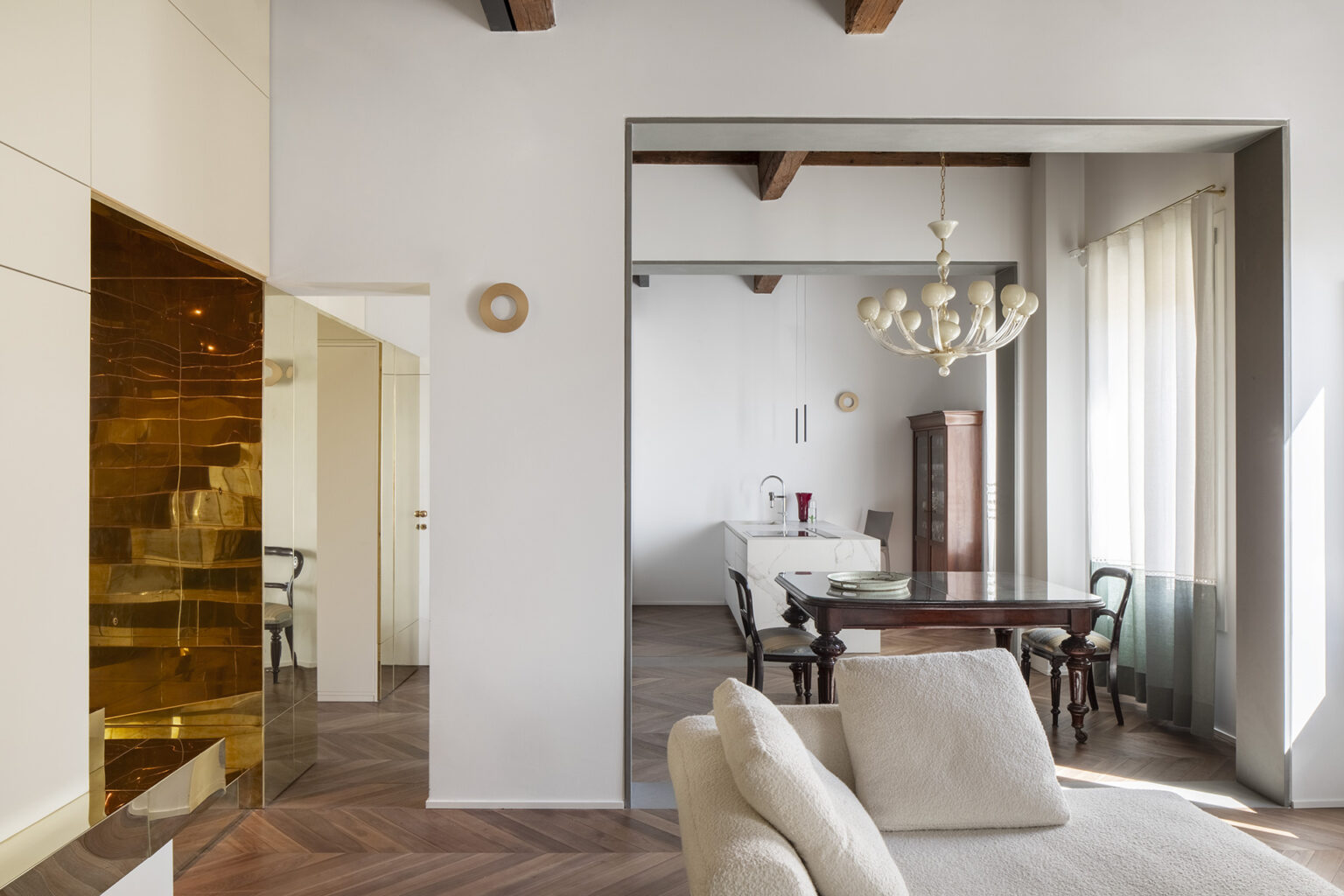 Le finiture riflettenti moltiplicano la luce naturale e artificiale, aumentando la percezione degli ambienti.