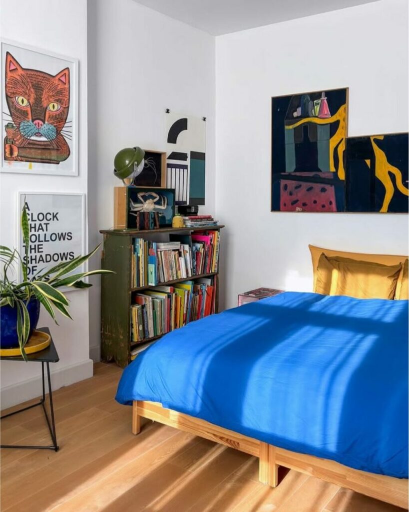 Se fare l’elenco degli artisti è qui impossibile – e faremmo torto a chi non è citato – quello dei brand e dei negozi di design è comunque lungo. Il salone per esempio trova spazio un po’ per tutto, dal grande divano a elle di Fést al patchwork di dipinti, opere grafiche e in 3D appese alla parete, con la sospensione della serie Arrangements di Flos che pende dall’alto. Superato il varco sotto i vetri piombati, l’attigua sala da pranzo è ugualmente piena zeppa di opere d’arte, sui muri quanto sul tavolo rosso circondato da sedie rigorosamente spaiate. Qui i marchi vanno da &Tradition a Ikea, da Seletti a Ferm Living, brand della libreria traboccante di volumi.