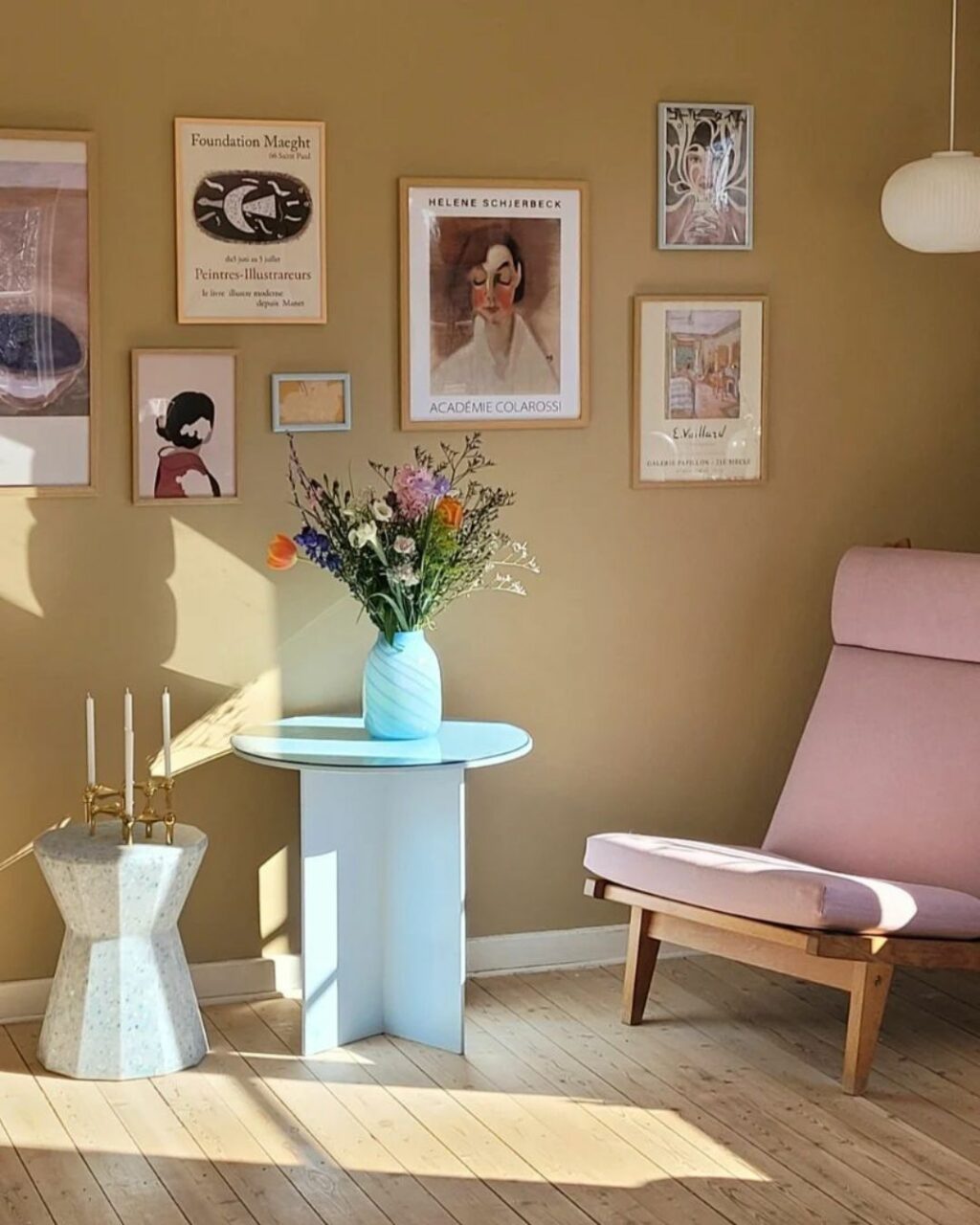Non sono da meno, in quanto ad accoglienza, gli altri angoli della zona giorno. Dal tavolo da pranzo di RN Design illuminato da lampade di HAY al divano in soggiorno e la poltrona di Getama accanto alla porta aperta sullo spazio esterno. A dominare ovunque sono i colori pastello, scelti in una tonalità un po’ polverosa che elimina ogni leziosità e dona una cert’aria antica.