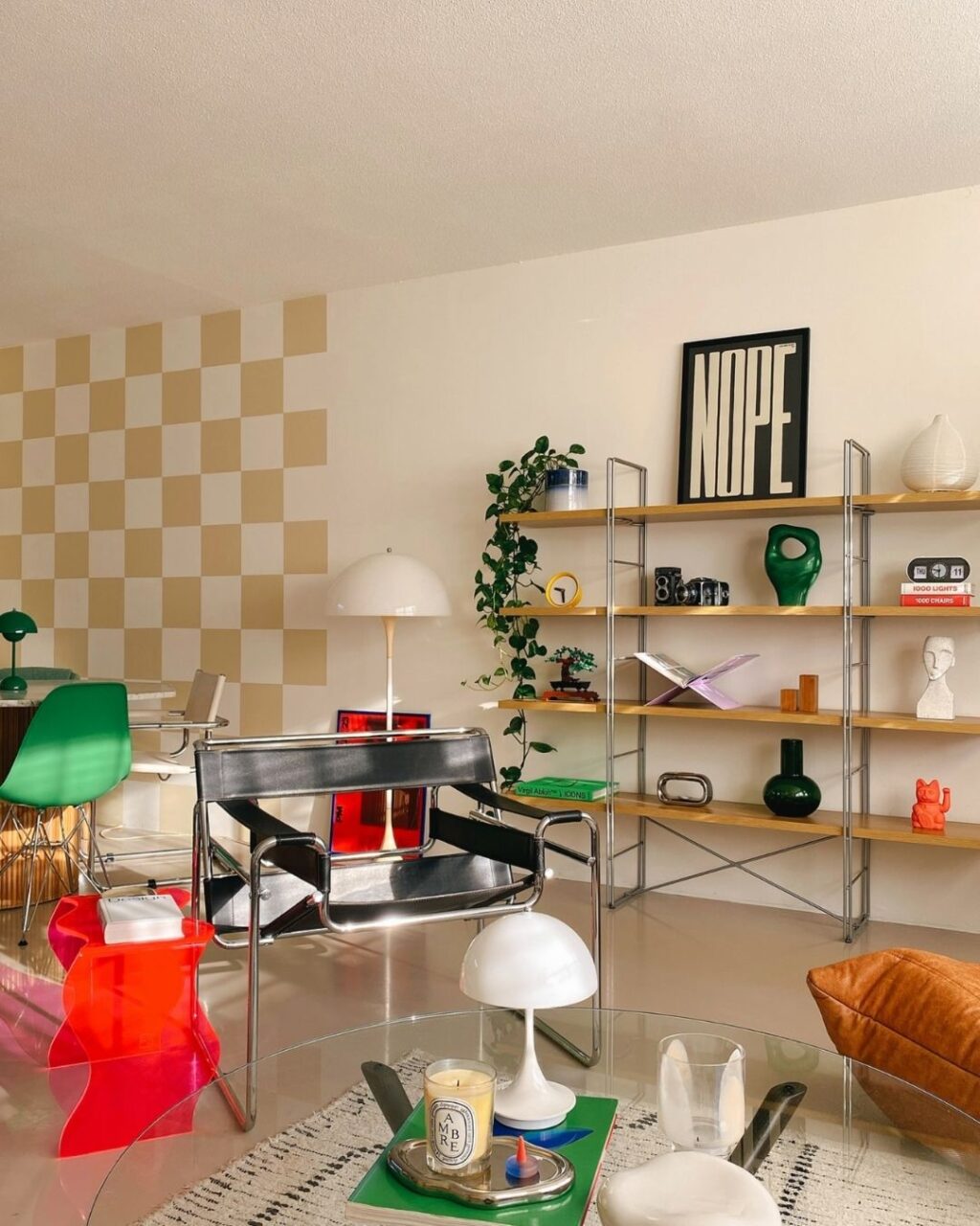 Appartengono, tra gli altri, alla produzione passata del marchio svedese anche la scaffalatura dai montati cromati e le mensole in legno, lo specchio dai bordi ondulati così come le sedie pieghevoli rosse e diversi accessori. Altri, ancora, sono stati usati come base per nuove creazioni che si accostano a quelle create ex novo come il menu a lettere mobili applicato alla parete dell’angolo caffè. Accanto al quale troviamo un frigorifero Smeg celeste con in cima, a mo’ di cappello, una lampada arancione di Artemide.