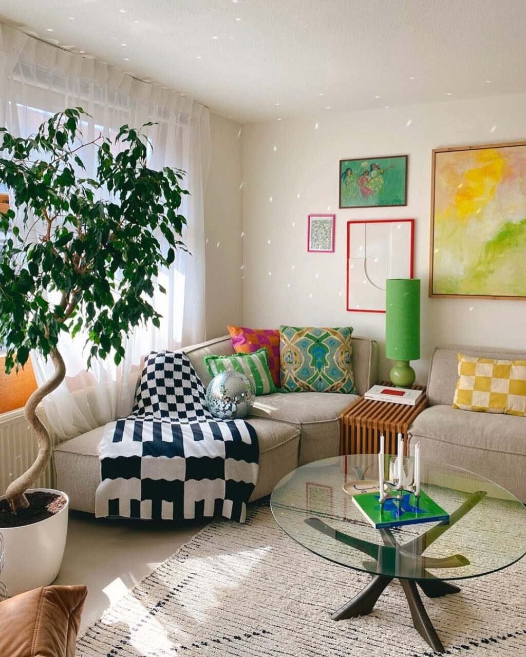 Si parte dal living, uno spazio ampio e luminoso dove trovano posto sia le sedute dell’area conversazione, con una Togo in pelle di Ligne Roset e il divano lilla trasformista di OMHU sul tappeto chiaro di HKliving, sia la zona pranzo. Qui una Panton Chair di Vitra si accomoda accanto a un’icona come la sedia Cesca, mentre una Flowerpot verde di &Tradition è posata sul piano ottagonale in marmo del tavolo vintage. All’angolo, un’eterea lampada da terra è uno dei tanti pezzi d’antan targati Ikea presenti in casa.
