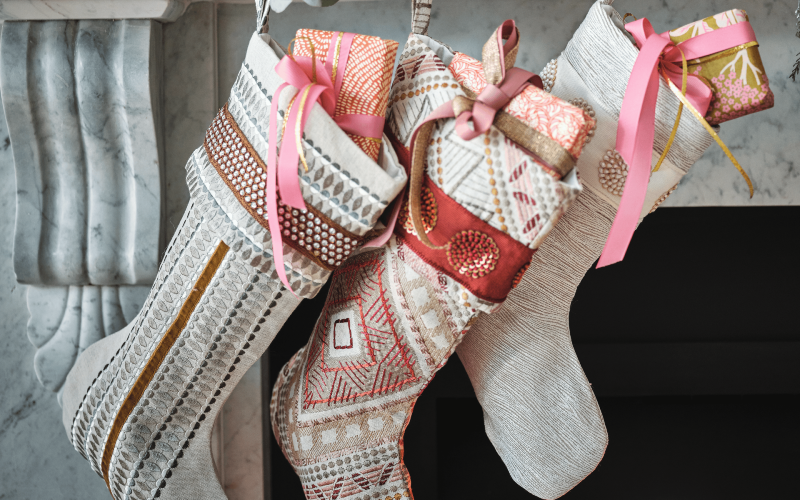 Dentro le calze realizzate con un mix di tessuti James Hare, regali avvolti in una selezione di carte decorative in vendita da Cox & Cox e Jane Means; nastri colorati in vendita da Samuel & Sons.